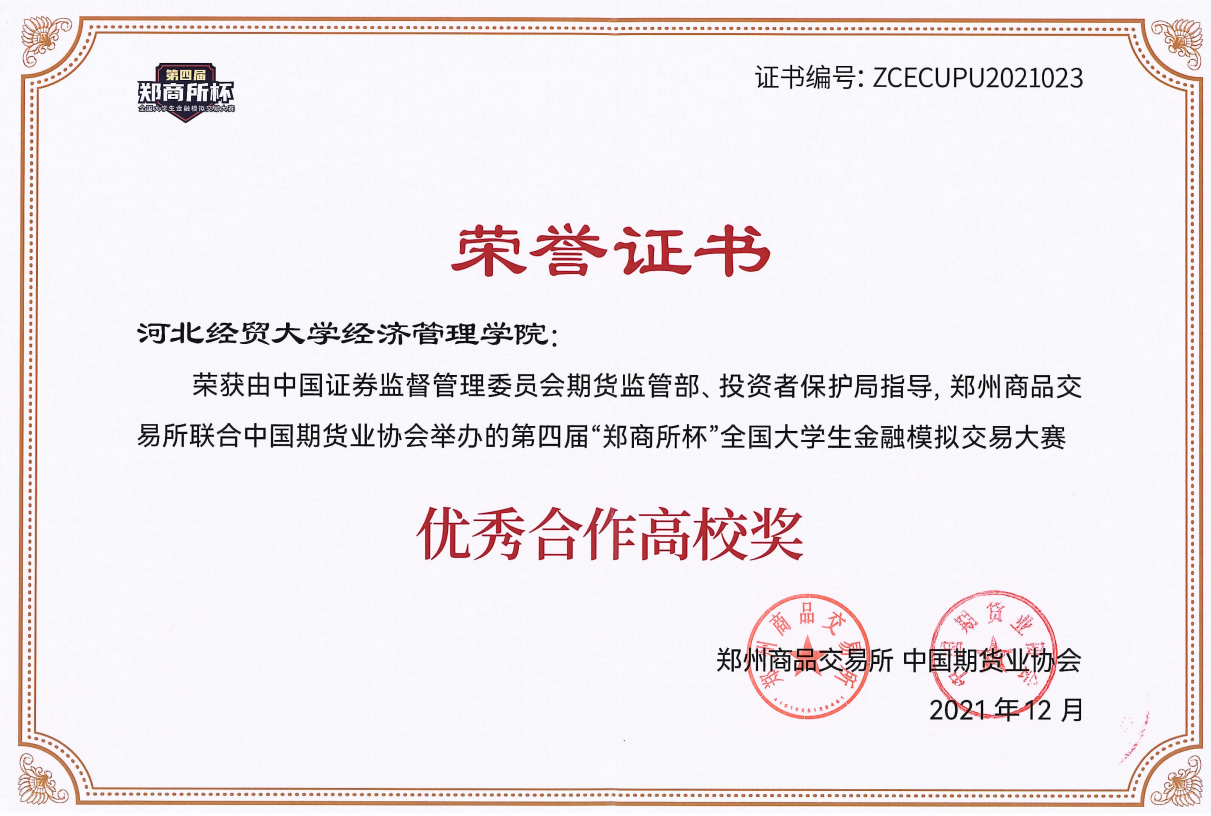 首次参加此项竞赛,实现了期货期权领域专业竞赛的历史性突破,在参赛师生的共同努力下,同浙江大学、南开大学等全国77所高校一同荣获优秀合作高校奖。