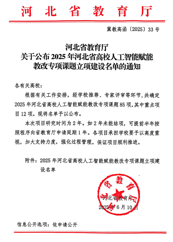日前,河北省教育厅发布了《河北省教育厅关于公布2025年河北省高校人工智能赋能教改专项课题立项建设名单的通知》(冀教高函〔2025〕33号),小黄书