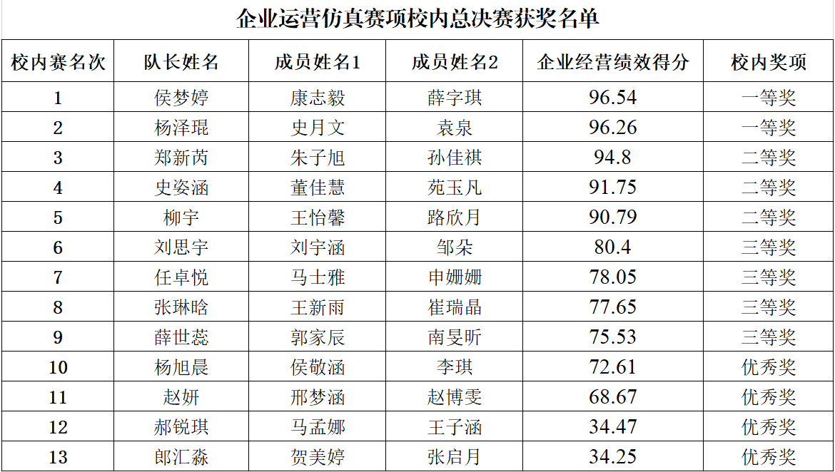 由实践教学部举办的“企业运营仿真竞赛模拟”实训暨中国大学生工程实践与创新能力大赛校内选拔赛在一教211213机房如期举行。在经历了1026日的校内初赛和1027日的校内决赛后,最终评选出一等奖团队2支,二等奖团队3支,三等奖团队4支。
