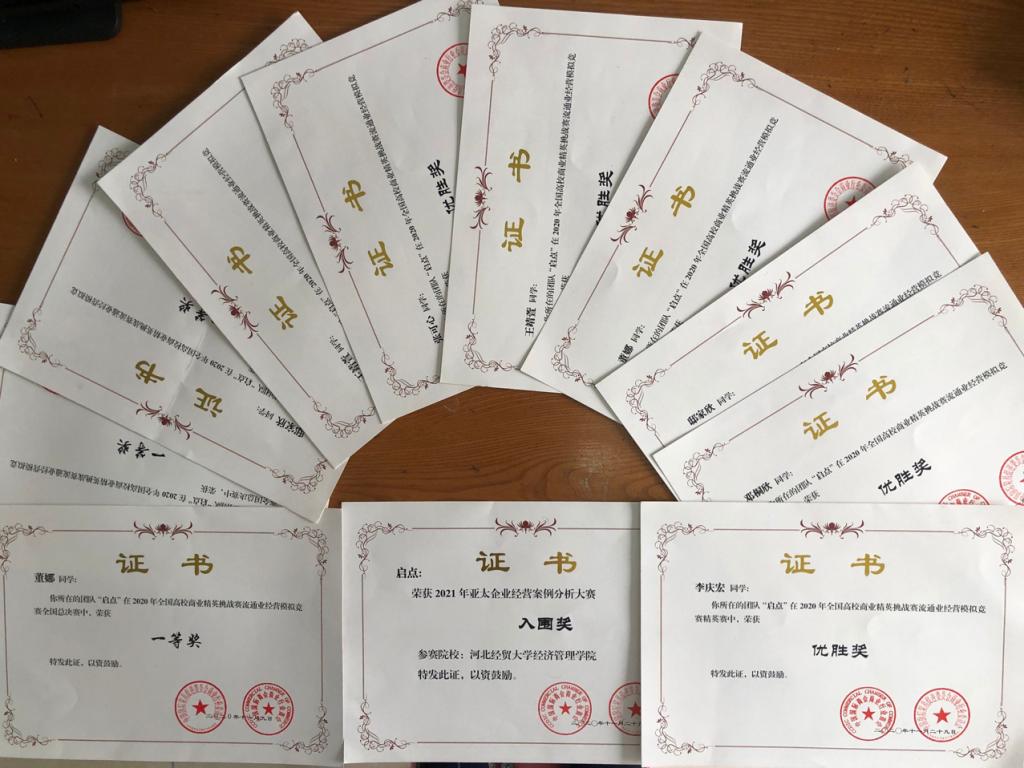 赴广西柳州参加了2020年全国高校商业精英挑战赛流通业经营模拟竞赛全国精英赛,在精英赛中斩获十强,取得争霸赛资格,并在争霸赛中荣获优胜奖以及2021年赴新加坡参加亚太企业经营案例分析大赛入围奖。小黄书
