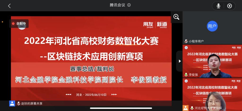承办,新道科技股份有限公司协办。大赛侧重培养大学生的区块链思维,正确理解区块链概念、技术、产业应用和创新等,能够正确识别区块链(联盟链)应用场景具备正确规划联盟链的目标、角色、业务流程和智能合约设计的能力,对新形势下财务数智化人才的培养起到了推动作用。本次大赛共评出一等奖5项,二等奖9项,三等奖14项。来自河北大学、河北师范大学、河北农业大学、河北地质大学等省内46支本科组参赛团队参加了本次比赛。