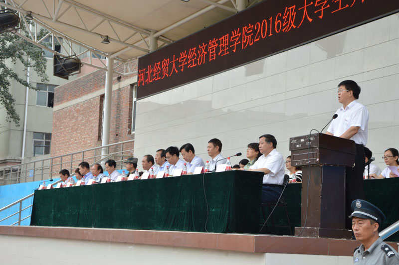校长纪良纲首先代表学校对新同学的到来表示热烈的欢迎。他简要介绍了学校的发展历程,并用“爱己、爱校、爱国”三个词寄语全体新生。他希望同学们爱惜自己,提升自己,在四年的大学生活中注重磨炼品格、丰富学识、投身实践以实现自己的价值和梦想。他希望同学们以校为荣,珍视荣誉。在学习过程中,不但要了解经贸的历史,还要传承经贸的文化,把自己融入到学校之中,与学校共成长、共进步。他还强调要以国为傲,激扬青春。鼓励同学们在学校积极投身社会实践,毕业时响应国家号召到西部去,到基层去建功立业,一展抱负。
