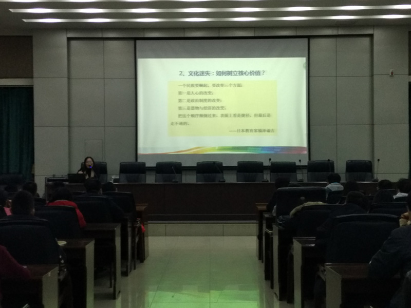 邀请马克思主义学院李英副教授以《习近平总书记的治国理政思想》为主题的专题讲座,学院党委副书记刘会娟出席,学生工作部、团委、各系团总支书记、学生社团学“习”会全体成员、以及大一新生班委三百余人参加。