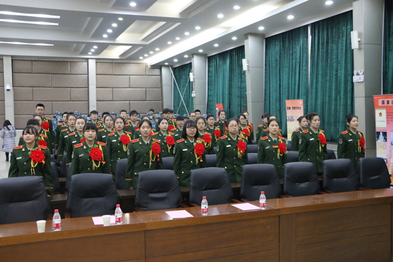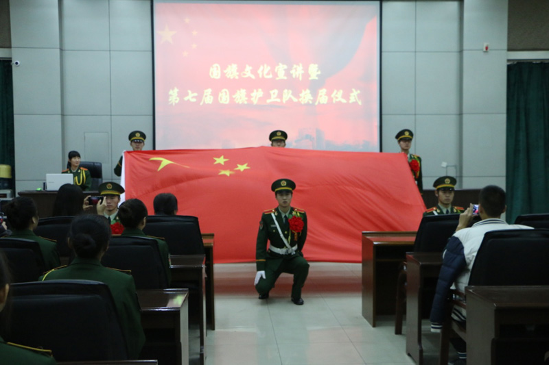 国旗文化宣讲暨第七届国旗护卫队换届仪式在图书馆报告厅举行。学工部部长杜兰柱、副部长王敏、学工部邱学亮出席活动,国旗护卫队14级队干,15、16级全体成员以及各系学生代表参加了此次活动。
