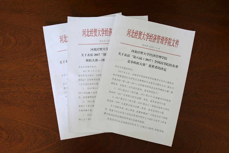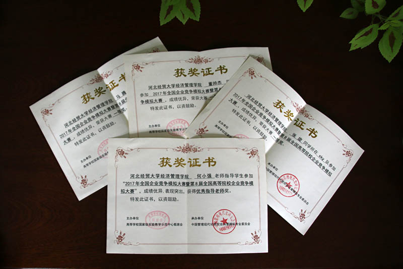 派出的三支代表队分别获得两个省赛一等奖,1个二等奖;在2016年12月“华北区第六届高等院校企业竞争模拟大赛”上,小黄书