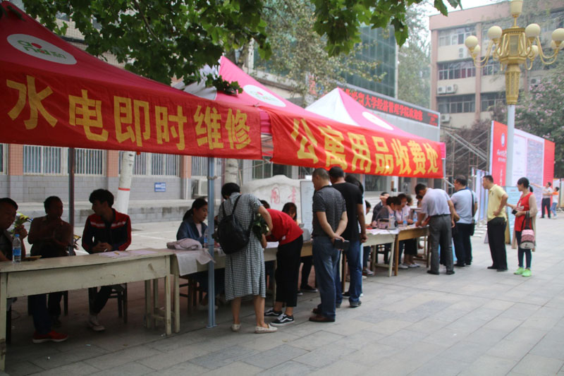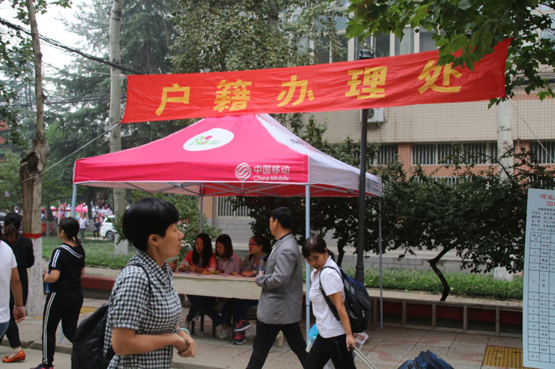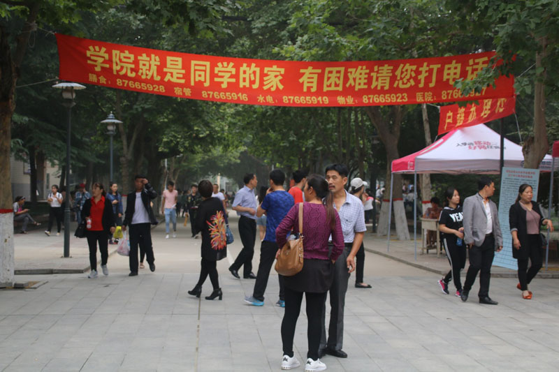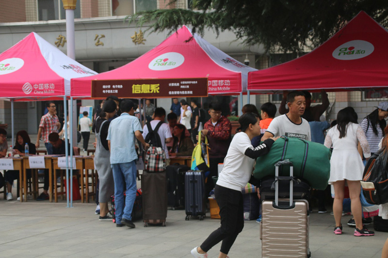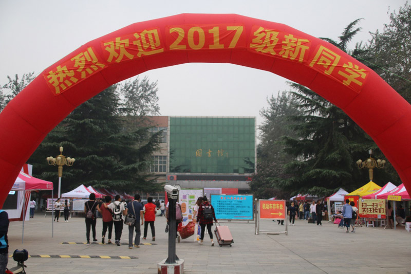 校园里营造出浓厚的迎新氛围,张贴了报到指示牌、校园平面图和安全提示,设置了招生咨询区、家长休息区和公共饮水区;各系和户籍、后勤、校医院等相关部门布置迎新帐篷、摆放宣传展架,展示校园风采、介绍相关政策;印有“小黄书