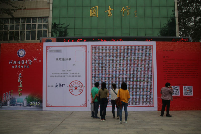 录取通知书”和“新生照片墙”的迎新主题海报格外醒目,引得新生和家长们驻足寻找自己的或自己孩子的照片,或拍照留念。值得一提的是,今年学院通过“互联网+”数字迎新系统开通网上缴费功能,大大提高了迎新效率。