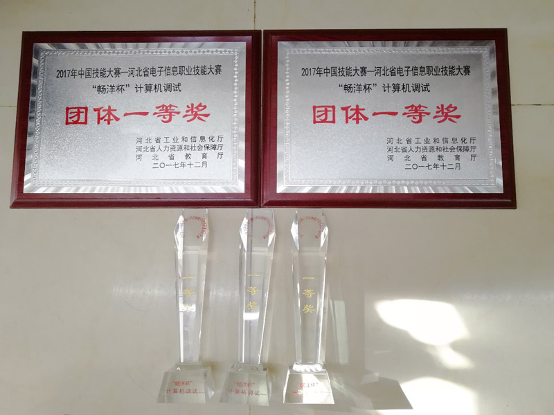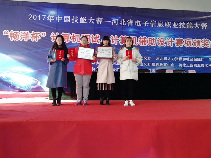 本次大赛由河北省工业和信息化厅、河北省人力资源和社会保障厅、河北省教育厅共同主办。大赛以“立足行业,结合实际,实战演练,促进就业”为宗旨,旨在推进信息化与工业化深度融合,培养适应电子信息产业发展和信息化建设需要的技能人才。来自全省企业、科研院所、中职和高等院校的120支代表队近400名选手参加大赛。由2015级计算机1班张红羽、王娣、黄文硕组成的经管1队,由2015级计算机2班王雪纯、王雪年、张腾飞组成的经管2队,在指导老师李福亮和高双喜带领下,认真准备,沉着应战,双双荣获一等奖,为小黄书