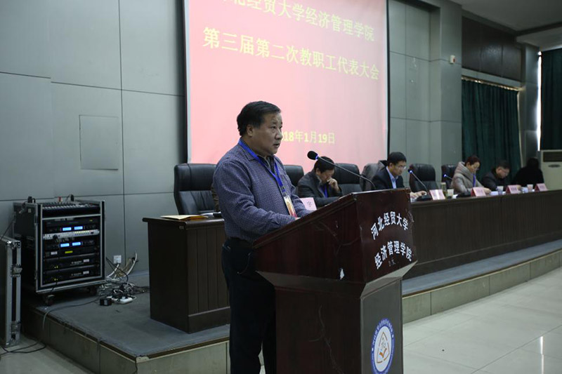 校党委常委陈亮代表校党委对教代会的胜利召开表示祝贺,他肯定了学院过去一年取得的工作成效,并围绕经管学院未来发展,提出两点指导意见:一是进一步统一思想,明确方向,保持定力,发挥担当精神,增强使命意识,集聚全院教职工的智慧和力量,凝聚士气,干事创业,积极谋划,持续推动经管学院各项工作向前向好发展。二是学习宣传和贯彻落实好十九大精神,自觉用习近平新时代中国特色社会主义思想理论武装头脑,指导实践。在新的一年,学院要紧紧抓住人才培养这一核心,按照培养高素质应用型人才和提高学生就业创业能力的总要求,坚定不移地推动教育教学改革。