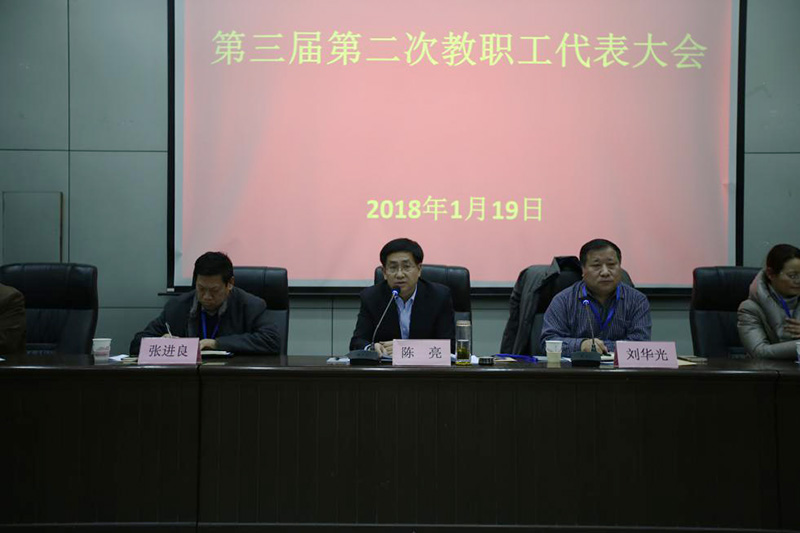 第三届第二次教职工代表大会在图书馆报告厅举行。校领导陈亮出席并讲话,学院全体领导出席大会,来自五个代表团的45名代表参加,大会由学院副院长赵宇主持。