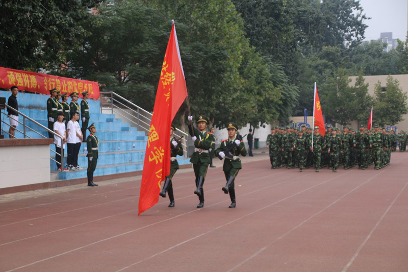 2018级军训结业式正式拉开序幕。“迎—院—旗!”3名身着礼服的仪仗队员护卫着鲜艳的院旗,昂首阔步走过阅兵场,全体同学向院旗行注目礼。