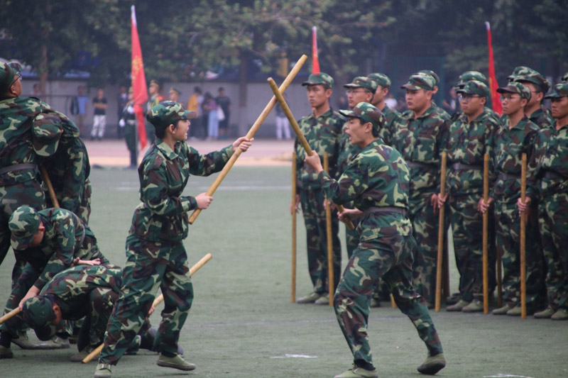 分列式表演中,全院新生6个连共19个方队精神饱满,迈着坚定的步伐依次通过主席台接受检阅,展示出经管学子朝气蓬勃、昂扬向上的精神风貌。随后进行了应急棍术、洪拳、匕首操、擒敌拳、处突棍法、海军旗语、队列展示等军事科目表演。同学们队列整齐,动作一致,声音高亢、气势如虹出,赢得了现场阵阵掌声。