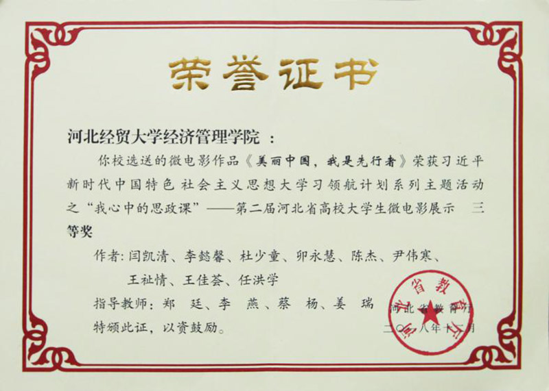 选送的微电影作品《美丽中国,我是先行者》荣获河北省三等奖,并受邀参加颁奖礼活动。