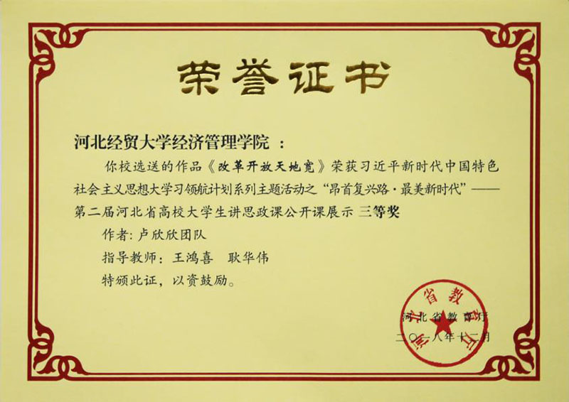 宣传部和各系积极筹备,精心选拔学生团队,推荐优秀作品参加比赛。由学生卢欣欣、王宏旭、王天艺、骆程组队制作的《改革开放天地宽》思政课,同省内30多所高校选送的作品竞争,最终获得三等奖,王鸿喜、耿华伟获得指导老师奖。