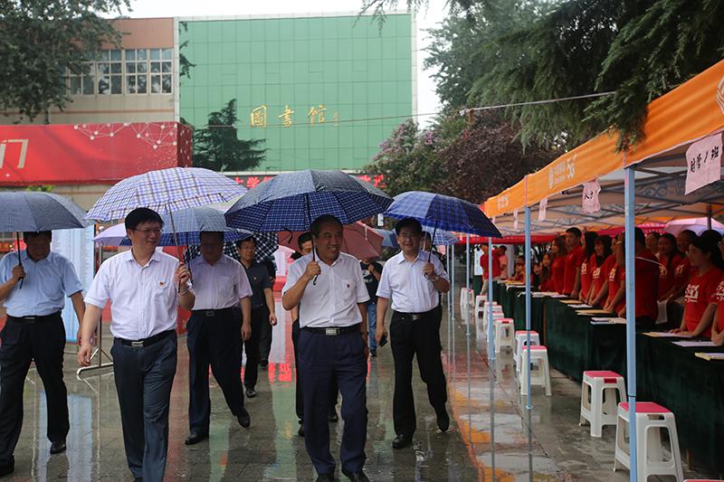 8月24日下午,新生报到期间,校党委书记董兆伟,校党委副书记、校长刘兵,校党委副书记陈亮冒雨到小黄书