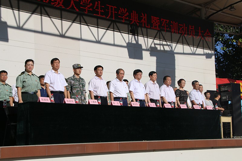 2019级大学生开学典礼暨军训动员大会在南校区操场举行。校领导董兆伟、刘兵、陈亮、刘建平和驻石某部队领导出席了典礼,学院领导、各系部负责人和全体新生参加了开学典礼。典礼由副院长赵宇主持,院长刘华光致辞,院党委书记张进良做军训动员讲话。