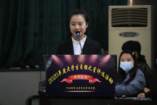 评选现场,14位优秀的经管学子分享了自己的成长历程和亲身感悟,从家庭成长环境,学习工作经历阐述了自己的自强奋斗之路。他们的演讲集中展现了当代大学生胸怀理想信念,坚定自我价值,牢记使命担当的良好品格,赢得了现场老师及学生的阵阵掌声。最终吴雪宁、孙世琪、徐华智、李丹阳、周应新、郝茂轩、张辰旭7位候选人脱颖而出,荣获2020年度“大学生自强之星”,高可心等7人获得“榜样先锋”荣誉称号。