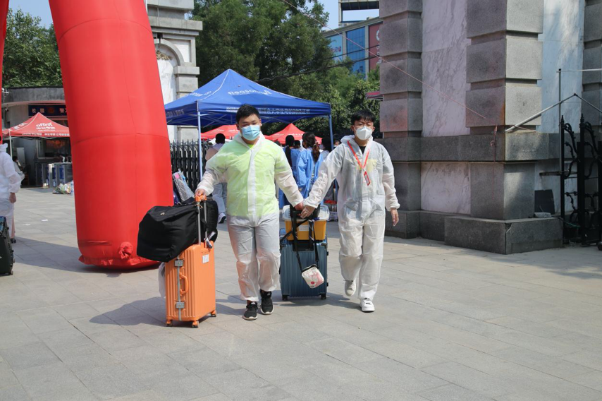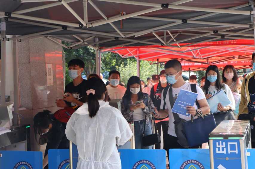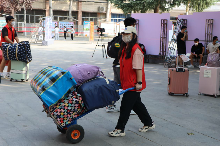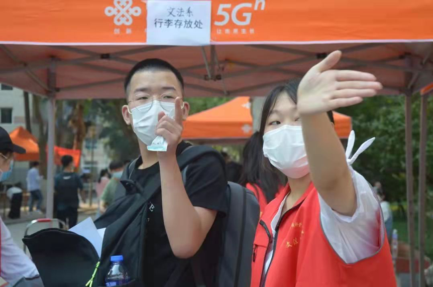 学院在火车站设立了接站点,志愿者身着防护服,迎接出站新生。报到现场开设新生入校通道和行李通道,新生们在入校通道经过测温、出示健康码和行程卡、人脸识别等流程后进入校园,经过抗原试剂检测、核酸检测后再由各系志愿者引导新生完成报到流程。他们的行李则由学生会志愿者全部酒精消毒后,通过行李通道放置于行李寄存处,待新生完成报到流程后,再由各系志愿者“一对一”搬运行李送达宿舍,搬运过程中志愿者们边走边介绍校园环境和生活经验,为新生们引路答疑。疫情防控,家长们虽然没能进入校门,但看到志愿者们热情暖心的服务,他们终于放下了那颗颗悬着的心。