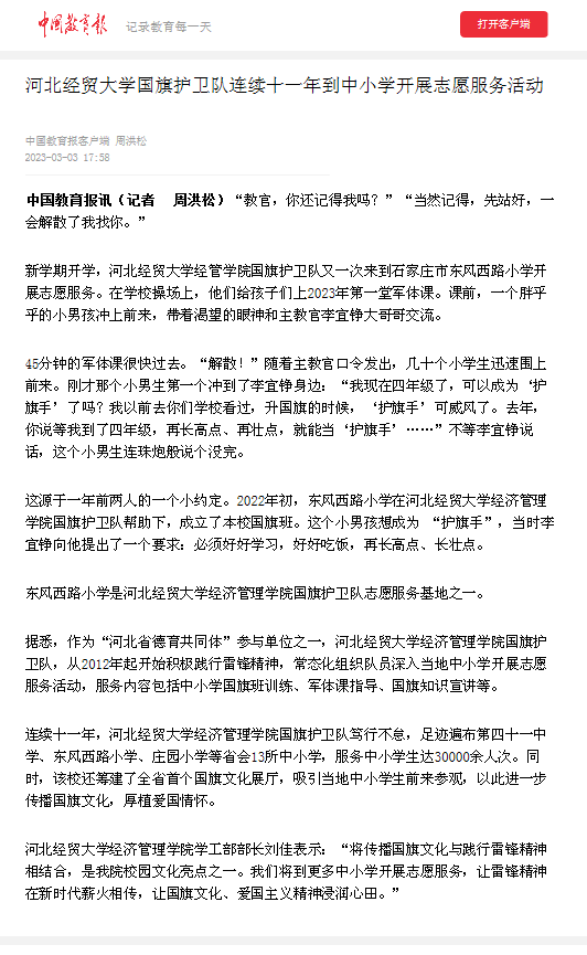 国旗护卫队从2012年起开始积极践行雷锋精神,常态化组织队员深入省会中小学,开展国旗班训练、军体课指导、国旗知识宣讲等志愿服务活动。11年来,国旗护卫队服务了石家庄市第四十一中学、东风西路小学、庄园小学等省会13所中小学,服务中小学生达30000余人次。同时,还筹建了全省首个国旗文化展厅,吸引中小学生前来参观,传播国旗文化,厚植爱国情怀。