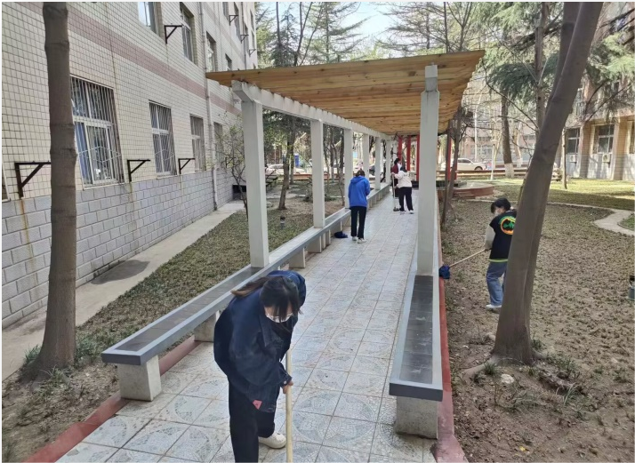 “清洁校园 共创文明”,各系组织青年志愿者走出宿舍,开展校园清扫服务。院团委组织百余名志愿者对二教、三教考场进行清扫规整,为小黄书