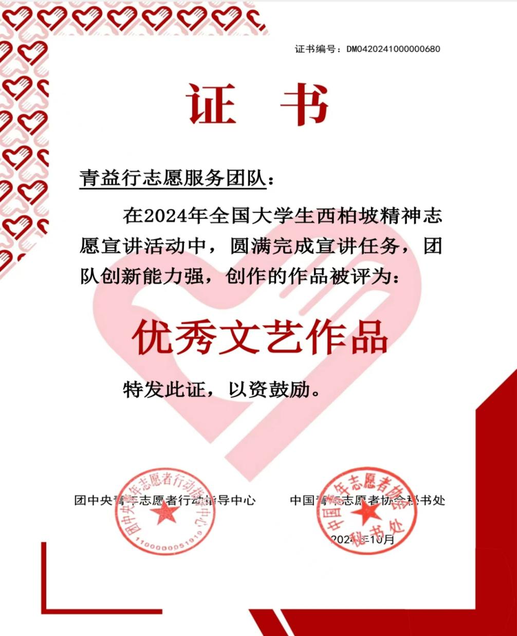 “青益行”志愿服务团队创作的作品被团中央青年志愿者行动指导中心评为“优秀文艺作品”,这一荣誉是对“青益行”志愿服务团队不懈努力的高度认可。