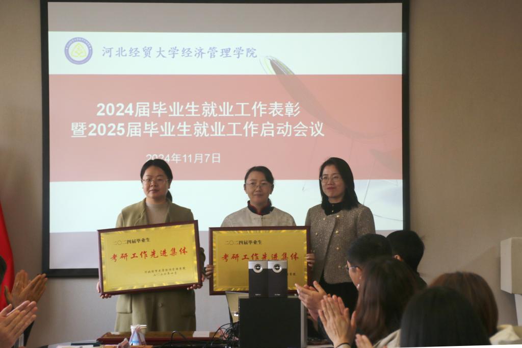 王鸿喜宣读了《2024届毕业生就业创业工作先进集体和先进个人表彰决定》。李福亮、唐振龙为考研先进个人颁奖;王慧霞、赵占亚为就业先进个人颁奖;韩平生为2024年就业日常优秀集体商务系颁奖;蔡杨为2024届毕业生考研先进集体和就业先进集体经济系、文法系颁奖。