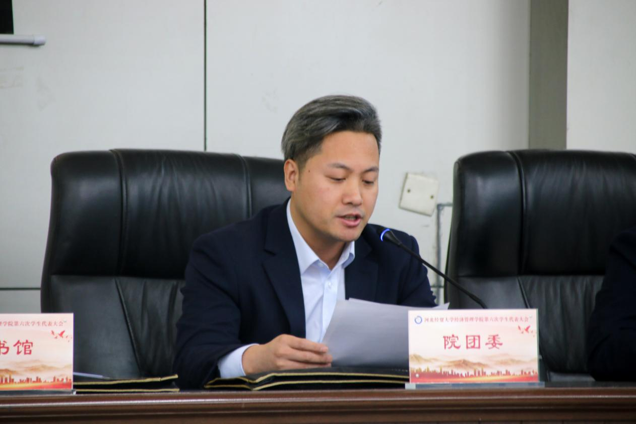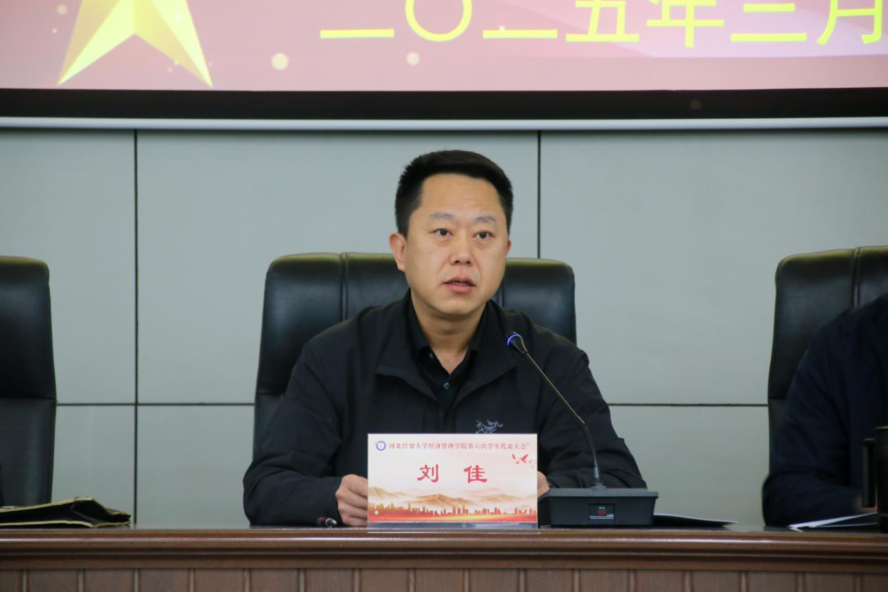 学院党委副书记刘佳代表学院党委向大会的召开表示祝贺,他首先肯定了过去一年学院各级学生会取得的成绩,并对学院广大学生干部和团员青年提出三点希望:一是希望团员青年要筑牢信仰根基,在树立理想信念、深耕专业知识、参加社会实践方面锻造成新时代高素质人才;二是希望学代会发挥引领作用,围绕教育教学、校园文化、服务保障等热点难点,积极建言献策,为学院发展注入青春动能;三是学生会要凸显纽带作用,要聚焦思想引领、权益服务、文化育人等主责主业,创新活动载体,打造品牌项目,构建“三全育人”同心圆。
