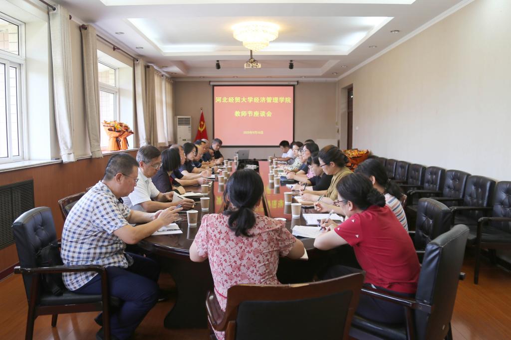 在五楼会议室召开教师节座谈会。院党委书记蔡杨、院党委副书记,院长李大庆、院党委副书记刘佳与各系主任、各教学部部长、教务部和各系教秘亲切座谈交流。会议由副院长王鸿喜主持。