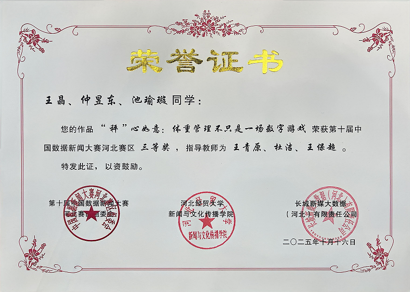 王晶、仲昱东、池瑜璇同学首次参赛表现不俗,其作品《“秤”心如意:体重管理不只是一场数字游戏》荣获该项赛事三等奖。