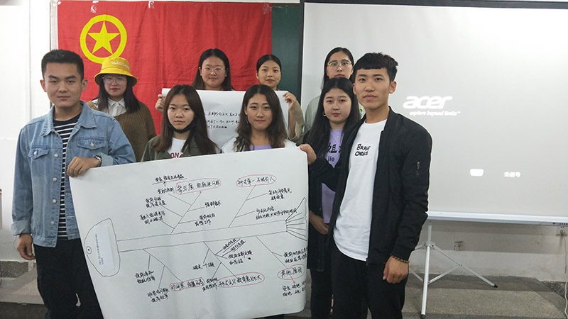 培训围绕团日活动开展过程中遇到的问题及改进措施、团干部在开展共青团工作中面临的困难及原因和团总支需要在哪些方面加大改革力度三个实际问题进行深入讨论。与以往不同的是培训采取“结构化研讨”方式进行,刘亚宁指导大家利用头脑风暴法、团体列名法、鱼骨图原因分析法、四副眼镜法根据抽签题目展开分组讨论,新颖的讨论方法极大地调动了小组成员的积极性,各种观点充分交流,激烈碰撞,最终形成小组意见依次上台展示交流。