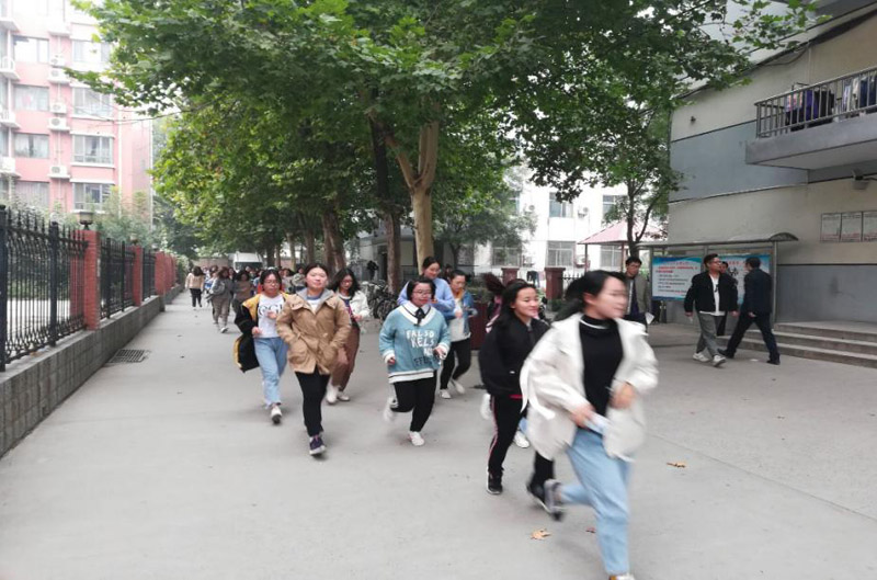 下午2点,逃生演练开始,工作人员到达指定岗位,引导宿舍楼内学生快速疏散,有序撤离到安全地带,演练用时1分58秒。