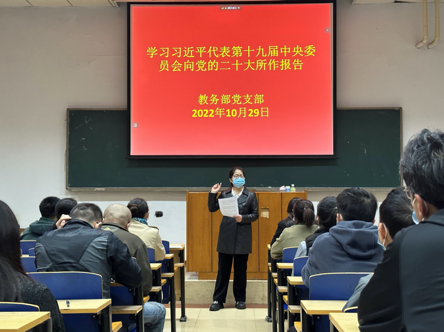 郭占欣对教务部党支部如何结合部门工作把学习贯彻二十大报告活动深入推动做了部署安排。她强调,教务部党支部一定要下好“学思践悟”关键棋,全体党员干部中要入脑入心、走深走实、见行见效,确保线下教学工作顺利进行,确保党的二十大精神及时融入到教学管理工作和支部建设全过程。