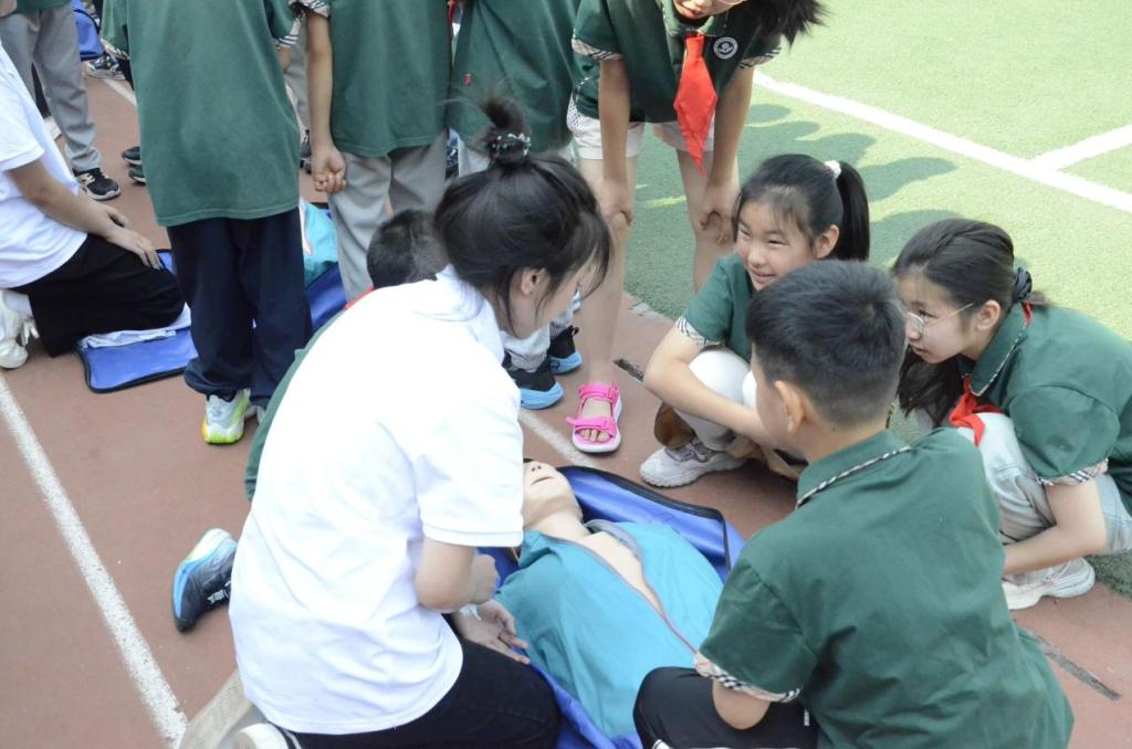 国旗护卫队穿着整齐的制服,庄严地护送五星红旗走向升旗台,激昂的国歌声中,全校师生肃穆而立,目光追随着徐徐升起的国旗,爱国情怀在心底悄然升腾。在志愿宣讲环节,国旗知识宣讲员范智博以生动故事与问答互动的方式向小学生们讲解国旗与国徽的由来、国歌法与国旗法、爱国主义教育法,学生们踊跃参与,现场气氛热烈。消防安全知识宣讲员胡晓悦给同学们讲解火的两面性、消防用品的使用以及火灾逃生要点等知识,直观呈现火灾的危害与预防,让学生们深刻认识到消防安全的重要性。在应急救护实操培训中,志愿者借助人体模型,现场示范心肺复苏、海姆立克急救法等操作,同学们在志愿者指导下积极尝试,初步掌握基本急救技能。整个活动中,穿插的趣味小问答调动了孩子们的积极性,孩子们脸上洋溢着欢快的笑容与求知的渴望。