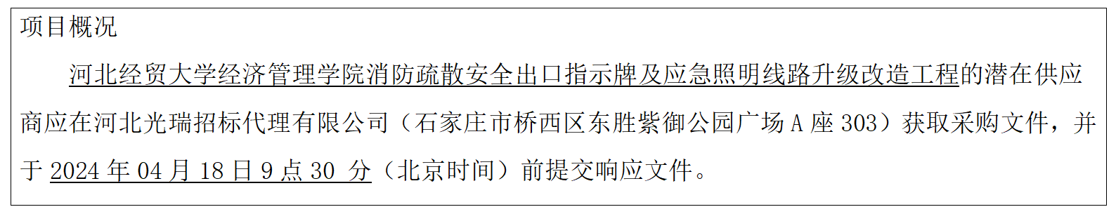 投标文件递交的截止时间(投标截止时间,下同)为2024年04月18日,上午9:30 ,地点为河北光瑞招标代理有限公司(石家庄市桥西区东胜紫御公园广场A座303)。