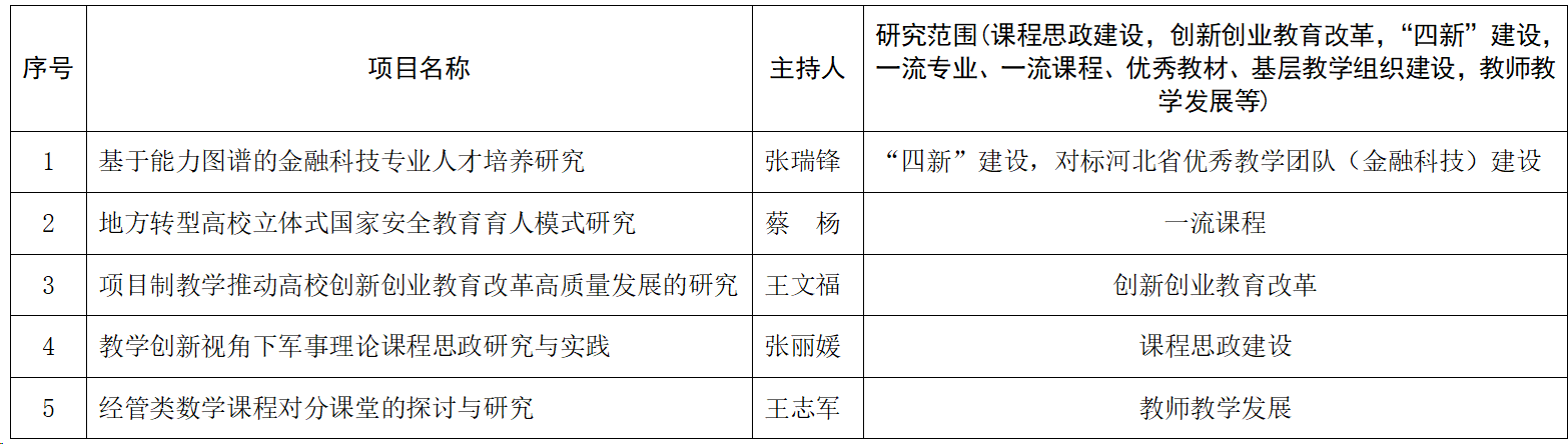 组织了项目申报工作。经个人申报、学院审核推荐,本次申报项目共8项。经专家评审,最终推荐5项申报河北省高等教育教学改革研究与实践项目,现对评审结果予以公示。