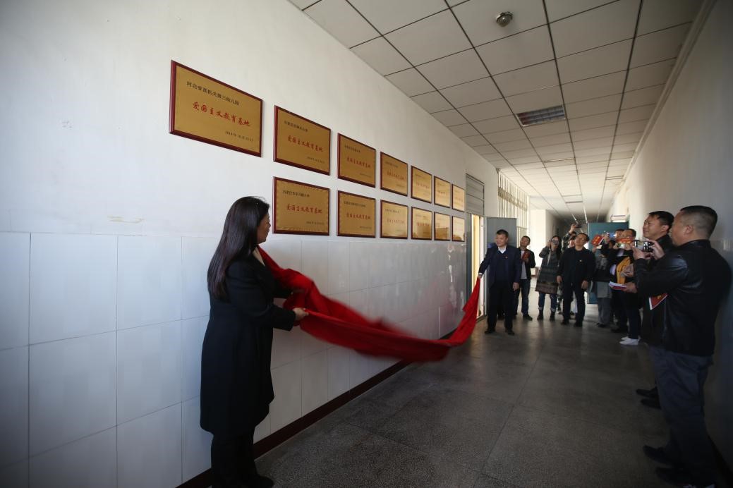 国旗文化教育展厅举行,河北省教育厅德育研究中心主任蔡杭州出席了活动,并和院党委副书记张丽英一同为爱国主义教育基地揭牌。