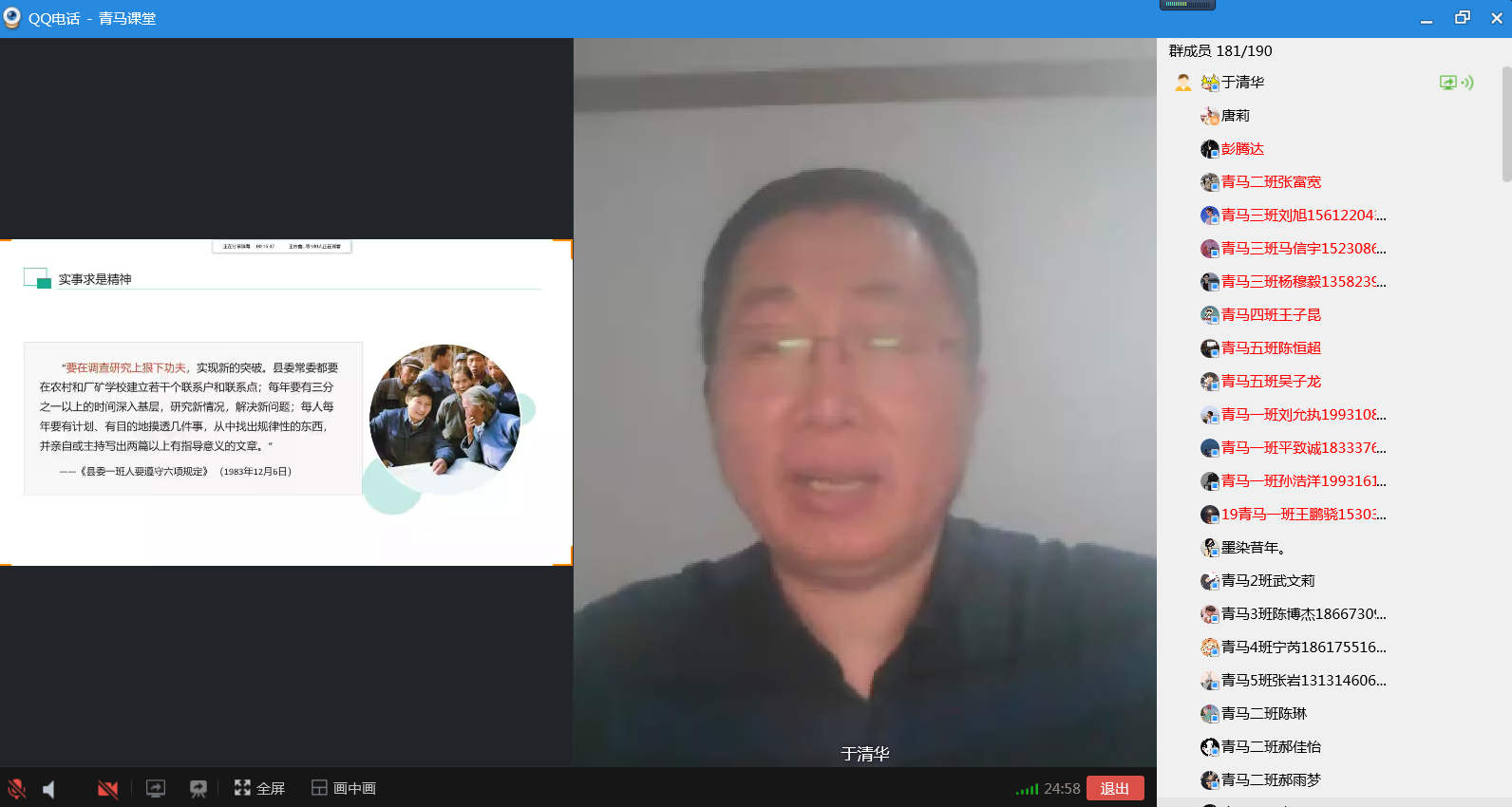 马克思主义学院于清华教授应邀为青马学员作“正定足迹,青年榜样”专题讲座,于清华围绕精神、足迹、思想、贡献四个关键词展开,向学员们展现了习近平总书记在正定从政期间实事求是、勇于创新、率先垂范、全心全意为人民服务的崇高精神,勉励同学们要从习近平总书记的成长经历中感悟人民领袖的优秀品质、工作作风和人格魅力,注重博学笃行,彰显青春担当。