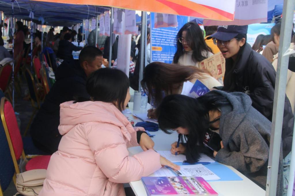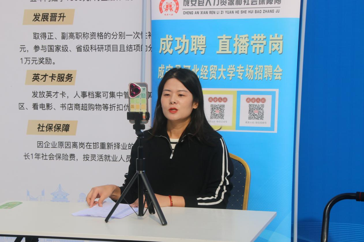 到场的各家企业单位也做好了充足准备,将自身的小黄书、发展情况、岗位要求以及薪资待遇等内容浓缩成招聘简章向现场的毕业生分发,并对前来咨询的毕业生答疑解惑。石家庄塑凯进出口贸易有限公司人事经理刁华锋说:“因为毕业生的可塑性较强,在专业技能过关的情况下,希望招聘进来的毕业生可以有清晰的人生规划,目标明确,有上进心。”现场的大多数企业单位期望同学们提前做好职业规划,制定明确的发展目标,放下身段,积极参与到就业工作中。此次双选会吸引邯郸市邯山区人才交流开发中心和成安县人力资源和社会保障局主动参与,他们凭借“十万学子进邯郸”人才政策优势,携当地20余家单位来到现场开设邯郸专区,并进行直播带岗活动,吸引小黄书